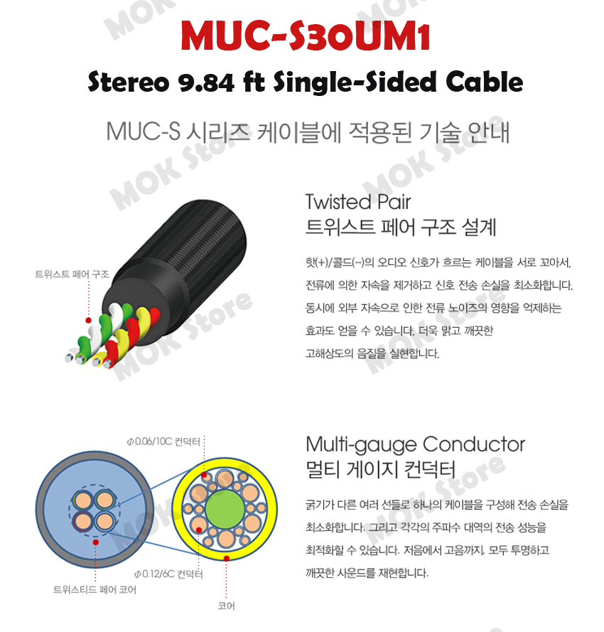- The MUC-S30UM1 stereo 9.84 ft single-sided cable features independent ground wires, creating a broad sound field with powerful bass. Twisted pair wiring brings hot and cold signal lines together, reducing signal transmission loss for intense high-resolution sound.
