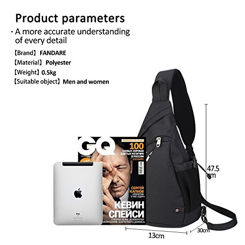 -. Feature : STRUCTURE: Length:13CM,Width:30CM,Height:47.5CM. Sufficient to carry your necessary things like phones, camera, umbrella, tablets, keys, cards, tissue, wallet, snacks,pens/markers, food bars, power bank, business cards, or so on. / Premium Materials& Hardware: Our designers carefully selected high-quality Polyester fabric, which is breathable, soft, lightweight, waterproof, and tear-resistance. The FANDARE is made from high-quality materials that will maintain their good looks for years to come. And with enhanced durability, the robust fabric can sustain the rigours of day-to-day use without showing signs of fatigue. All zippers with high quality , making it zipped smoothly. / Characteristics: Great flexibility, haversack can be used both as chest pack and shoulder bag, messenger bag, travel bag; Satchel strap is adjustable and can be left or right shoulder, Fit both regular and plus-size person. / Applicable Occasions: It can be used for hiking,traveling,cycling,school,working,business,leisure,dog walking, strolling, vacation, sightseeing, gym, cycling, biking,camping,mountaineering,sports,vacation,outdoor activities,shopping etc. And it is also a good present for friends and family. / After-Sales Service: FANDARE devotes to provide whole-hearted service for each customer, If for any reason you do not satisfy with our products, please feel free to contact our service department, we will try our best to solve your problem and offer timely and reasonable solutions for you as well. If it's quality problem, we will return or change the products for you within 90 days. Warranty is 1 year.