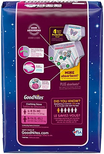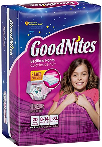 -. Binding : Health and Beauty -. Brand : GoodNites -. Department : Girl -. EAN : 0036000307146 -. Feature : Goodnights Bedtime Pants fits girls from 60 to 125 lbs (Clothing Sizes 8-14). / Goodnights bedwetting underwear have 40% more absorbency than training pants (vs. the leading brand size 4T/5T training pants). / New zoned protection where girls need it most with and 25% stretcher sides to fit and move like underwear. / Comfortable feel and underwear-like fit that provides discreet bedwetting protection under pajamas, and cool designs. / Eligible for FSA (Flexible Spending Account) Purchase. -. IsAdultProduct : 0 -. Label : Goodnites -. Manufacturer : Goodnites -. Model : 30714 -. MPN : 30714 -. PackageQuantity : 3 -. PartNumber : 30714 -. ProductGroup : Health and Beauty -. ProductTypeName : HEALTH_PERSONAL_CARE -. ProductTypeSubcategory : 12102001 -. Publisher : Goodnites -. Size : Size 4 -. Studio : Goodnites -. Title : Goodnites Underwear - Girl - Large/X-Large - 20 ct -. UPC : 036000307146