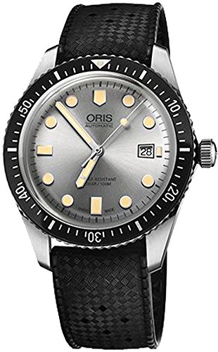 -. Feature : Stainless steel case with rubber strap. Uni-directional rotating bezel. Silver dial with silver-tone with luminous fill hands and index hour markers / Minute markers around the outer rim. Dial Type: Analog. Luminescent hands and markers. Date display at the 3 o'clock position / Oris Calibre 733 base SW200-1 automatic movement with about 38 hours of power reserve. Scratch resistant sapphire crystal. / Screw down crown. Solid case back. Case size: 42 mm. Round case shape. Deployment with push button clasp / Water resistant at 100 meters / 330 feet