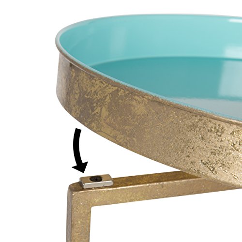Studio : Uniek Publisher : Uniek Product Description Next time you throw a party, do not worry about taking out those old wooden tray tables your parents passed down to you from their stuffy storage area. You now own these hip modern and functional metal tray tables! The Celia collection brings a pop of glamour to your home decor! This metal pop up end table is designed to be the perfect height to fit in a tight space next to a bed or alongside a sofa. It also makes an adorable plant stand! With beautifully elegant straight legs, a round tray tabletop surface, and the option to fold away for storage, this small pedestal table will be the perfect accent piece in your home. The tray top secures to the legs with magnets to allow for sturdy display and easy remove-ability. 0