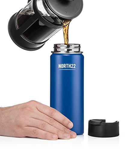 NORTH22 Vacuum Insulated Stainless Steel Bottle / Travel Coffee Mug, Keeps Drink Hot or Cold, Wide Mouth with 2 lids (18 Ounce, Blue)