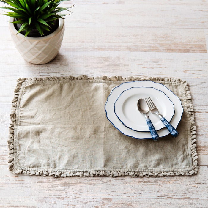 테이블 코디네이트에 사용하기 쉽은 무지가 심플한 디자인이지만 호화인 프릴이 설치되어 있습니다.
