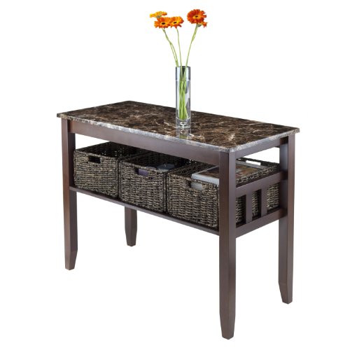 -. Binding : Kitchen -. Brand : Winsome Wood -. Color : Brown -. EAN : 0021713763426 -. Feature : Faux marble top with 3 corn husk baskets / Has a 60 days free replacement policy for any missing/damaged parts; Replacements due take 5-7 business days to ship out / Assembly is required, all hardware is included in the package -. Label : Winsome Trading -. Manufacturer : Winsome Trading -. Model : 76342 -. MPN : 76342 -. NumberOfItems : 1 -. PackageQuantity : 1 -. PartNumber : 76342 -. ProductGroup : Furniture -. ProductTypeName : HOME_FURNITURE_AND_DECOR -. ProductTypeSubcategory : 19605005 -. Publisher : Winsome Trading -. Studio : Winsome Trading -. Title : Winsome Wood Faux Marble Top Zoey Console Table with 3 Baskets -. UPC : 021713763426
