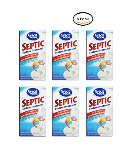 -. Brand : Great Value -. EAN : 0658448749410 -. Feature : Helps prevent septic tank buildup / Safe for all pipes / Treats entire septic system for one full month -. LegalDisclaimer : Actual product packaging and materials may contain more and different information that what is shown on our website. we recommend that you do not rely solely on the information presented that you always read labels, warnings and direction before using and consuming a product. -. ProductGroup : Kitchen -. ProductTypeName : KITCHEN -. Title : PACK OF 6 - Great Value Septic System Treatment, 9.8 oz -. UPC : 658448749410