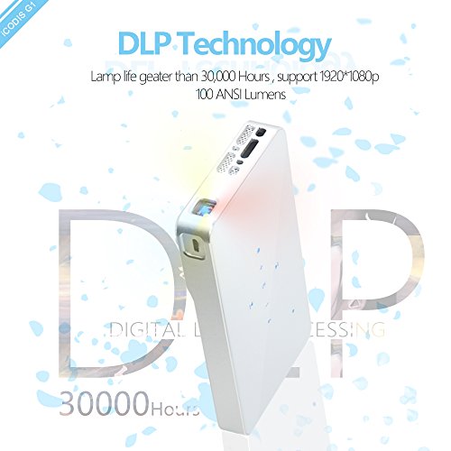 DLP Technology:G1 Mobile Projector use DLP Technology with 100 ANSI lumen brightness,Native Resolution 854X480 and Support 1920*1080 , 30,000 Hour LED Life, and a projection display size of up to 120 Inches.