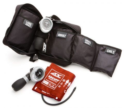 -. Feature : A multi-pocketed heavy duty black nylon zipper case that keeps each component securely in place, yet instantly accessable / Case measures a compact 8" x 6" x 2" that can be easily stored in most emergency boxes and trauma kits / The 4 cuff model includes adult, child, infant, and large adult adcuff nylon cuffs and one-tube bladder with quick release luer slipp connector / Features our new 804 ambidextrous palm gauge with high impact casing and trigger valve / Assembled, inspected, and packaged in the usa from foreign componants