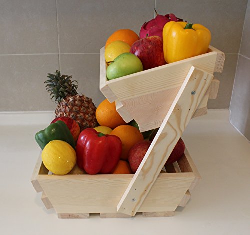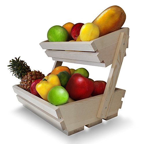 FRUIT BASKET STAND, PREMIUM 2 TIER WOODEN DISPLAY RACK FOR FRUITS AND VEGETABLES, STORAGE, HOLDER & ORGANIZER FOR YOUR KITCHEN COUNTER, RUSTIC COUNTERTOP LOOK, COMES FULLY ASSEMBLED