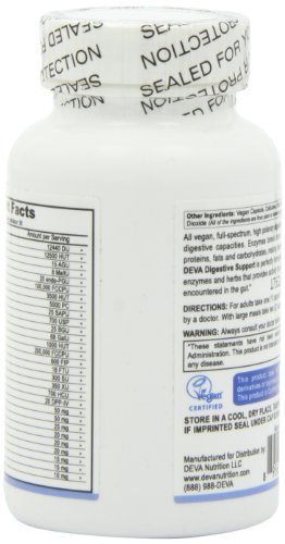 ReleaseDate : 2010-09-15 Studio : Deva Vegan Vitamins Publisher : Deva Vegan Vitamins Binding : Health and Beauty Product Description Enzymes break down the nutritional components of proteins, fats and carbohydrates, making these nutrients available for the body.? DEVA Digestive Support is perfectly formulated to contain a unique blend of enzymes and herbs that provides activity throughout various pH levels encountered in the gut. 0