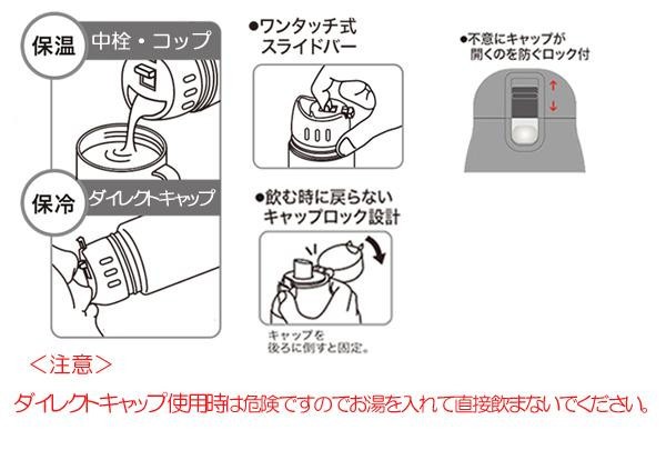 | 仕様 | 電子レンジ:使用不可 食洗機・乾燥機:使用不可 【容量】 ダイレクトキャップ使用時:470ml 中栓・コップ使用時:430ml 【保冷効力】 ダイレクトキャップ使用時:8度以下(6時間) 中栓・コップ使用時:8度以下(6時間) 【保温効力】 ダイレクトキャップ使用時:45度以上(24時間) 中栓・コップ使用時:73度以上(6時間) |