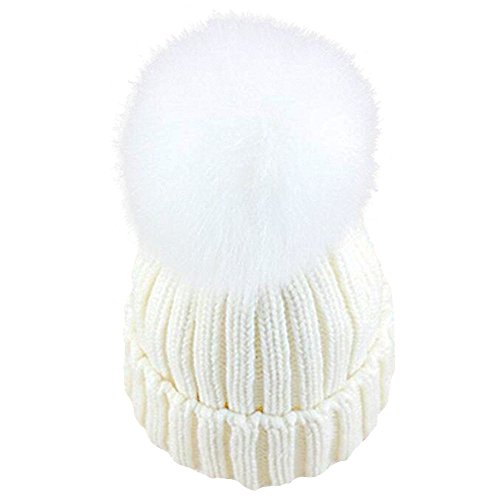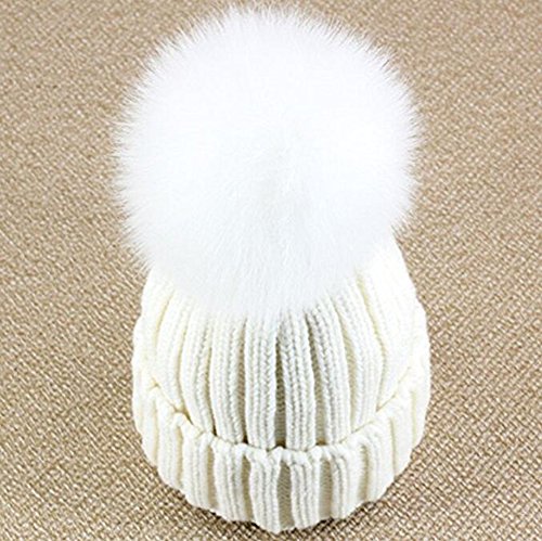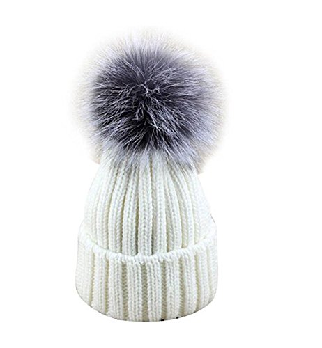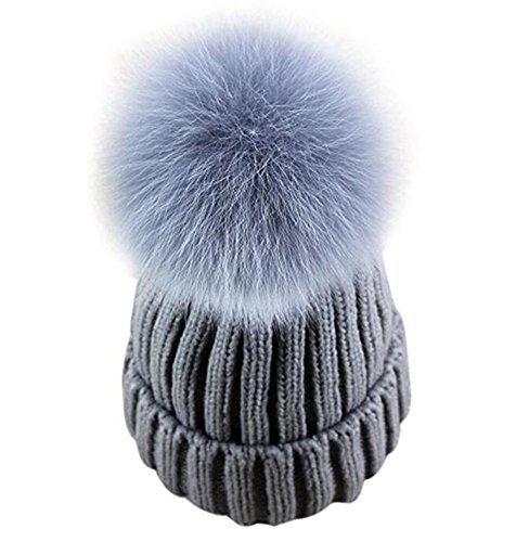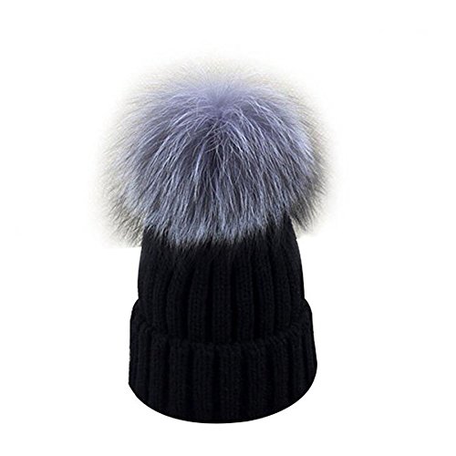 GuoMan Womens Girls Knitted Fur Hat Real Large Silver Fox Fur Pom Pom Beanie Hats