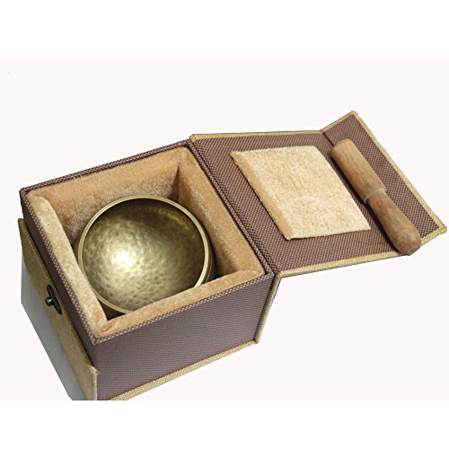 COMPETE SET includes one Nepalese four-and-a-half-inch high-quality buddhist bowl made of seven different metals including copper, iron, tin, lead, zinc, silver, and gold using the genuine Tibetan techniques; a real silk cushion, a wooden mallet, and a handmade gift box made of Lokta paper;