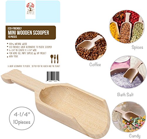 Better for the environment than plastic, Completely Biodegradable. Eco friendly Mini Wooden Scooper : 10 Pieces Use for: Scooping Candy, Spices, Dry Fruit, Nuts, Bath salts, Laundry Detergen, Tea, Coffee Measure: 4" in Length Material: 100% natural solid Birch Wood Non Toxic: no plastics or harmful chemicals Utelise for: - For Home use, party supplies Art project
