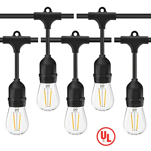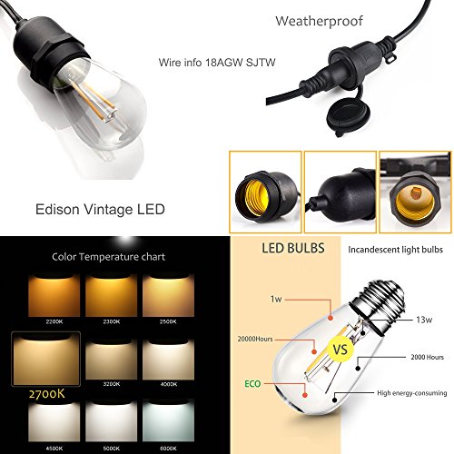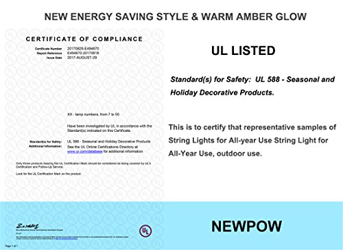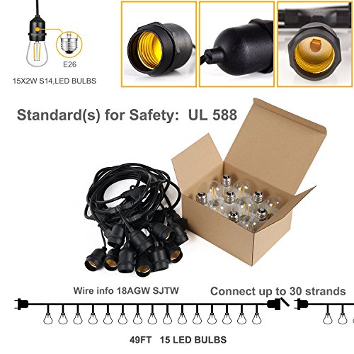 - Standard(s) for Safety: UL 588 - of String Light for All-Year Use, outdoor use.15 LED Bulbs - 49Ft. EASY TO INSTALLATION: Use cup hooks, guide wires, or zip ties with the built-in loops to hang perfectly. End to end connectable up to 30 strands. Each socket and bulb on every strand are inspected before leaving the factory -Top Quality- 90% energy saving (2watt each) -Not incandescent light bulbs.Much lower wattage will save you much bill.
