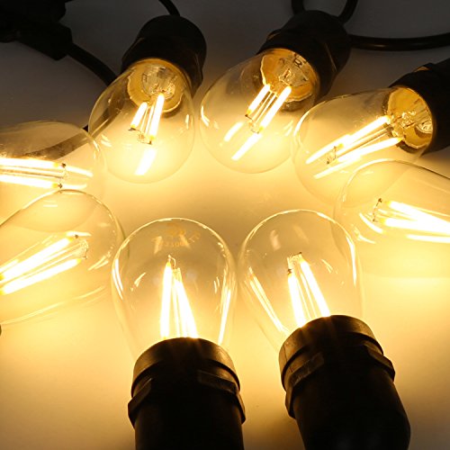 - The warm amber glow giving off from the nostalgic Edison bulb filaments brings you a beautiful atmosphere, where you can enjoy the lovely nights and the romantic dinners. Commercial Quality & great for indoor / outdoor lighting applications. Great for patios, decks, weddings, parties, umbrellas, backyard, deckyard, canopy, bistro, pergola.