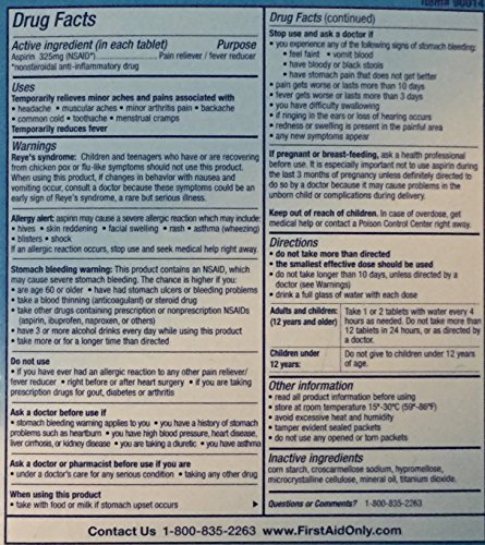 -. Binding : Office Product -. Brand : First Aid Only -. EAN : 0092265084109 -. Feature : Medicine Special Features: Regular Strength Aspirin / For Use With: First Aid Stations/Kits, Individual Use / Global Product Type: Medicines / Post-Consumer Recycled Content Percent : 0 % / Compliance, Standards: Not Returnable -. Label : First Aid Only -. Manufacturer : First Aid Only -. MPN : FAOH410 -. PackageQuantity : 1 -. PartNumber : FAOH410 -. ProductGroup : Office Product -. ProductTypeName : OFFICE_PRODUCTS -. Publisher : First Aid Only -. Studio : First Aid Only -. Title : First Aid Kit Refill Regular Strength Aspirin, 50 2-Tablet Packs -. UPC : 092265084109