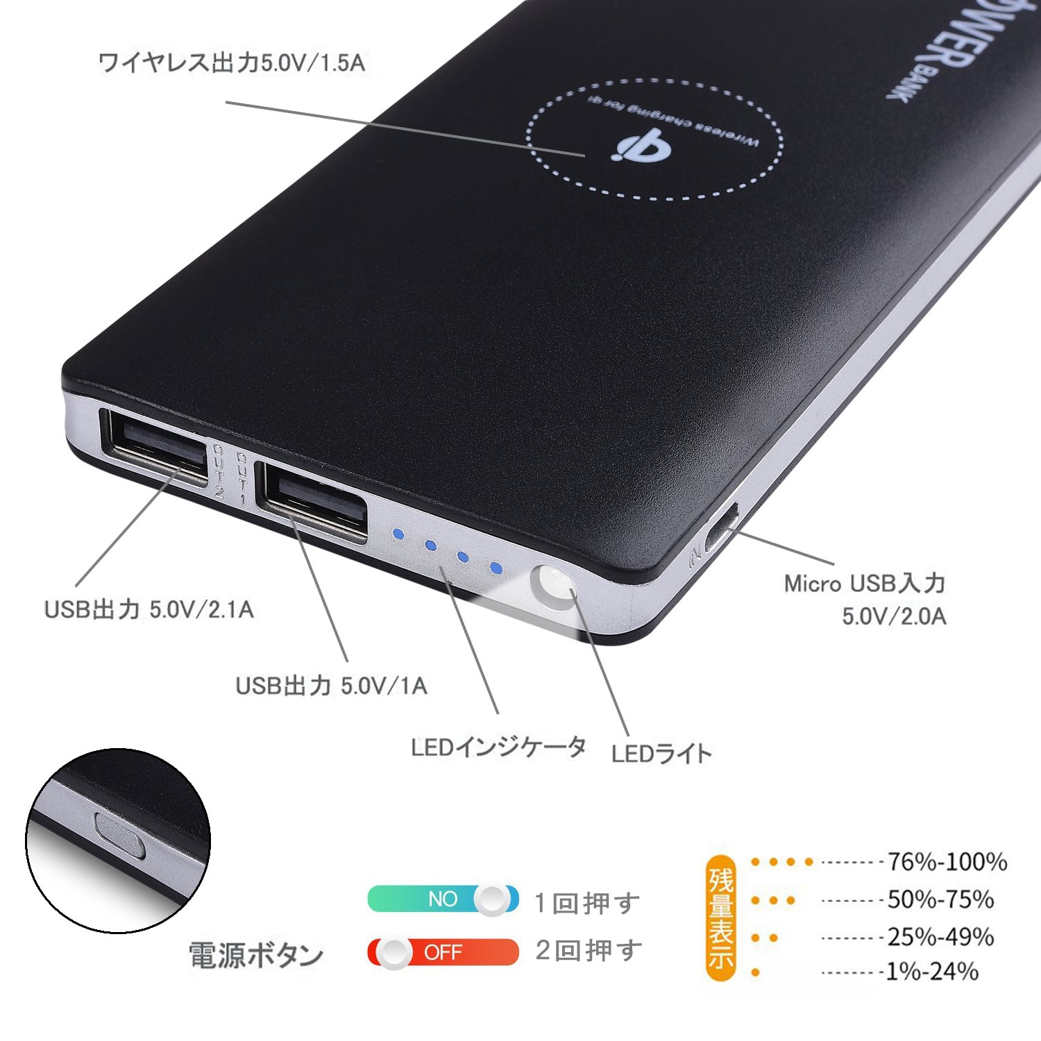 We built carefully selected Lithiwam Polymer Battery, realized a large capacity of 10000 mAh, and reduced the weight and thickness of the main body.