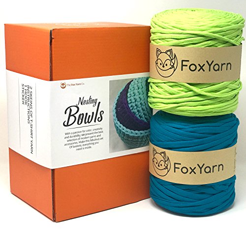 T-Shirt Yarn Nesting Bowls Yarn Kit - Includes 2 Rolls, Pattern, Hook, Label, Stickers - Fettuccini Zpagetti (Lime/Aqua)