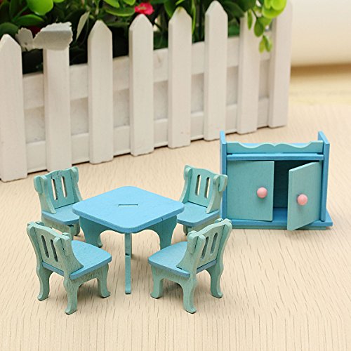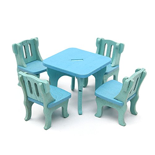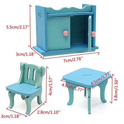 Material: Wood Main Color: Blue Green Chair Size: (L)X(W)X(H)3X2.8X4cm /1.18'X1.10'X1.57'(appr.) Table Size: (L)X(W)X(H)4.5X4.5X3.8cm /1.77'X1.77'X1.50'(appr.) Cupboard Size: (L)X(W)X(H)7X3X5.5cm /2.76'X1.18'X2.17'(appr.)
