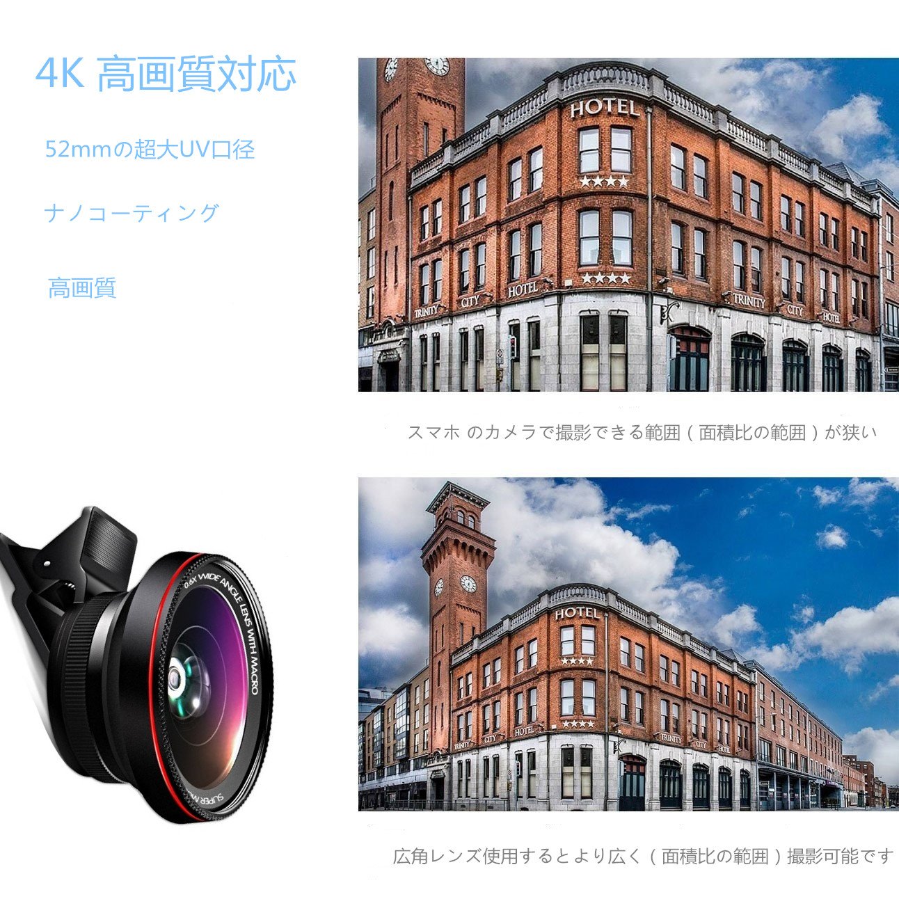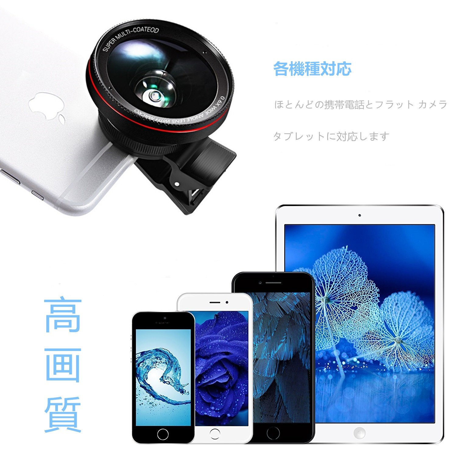 Easy installation Just pinch it, with wide angle and closeup lens, can handle most mobile phones and flat cameras and tablets.