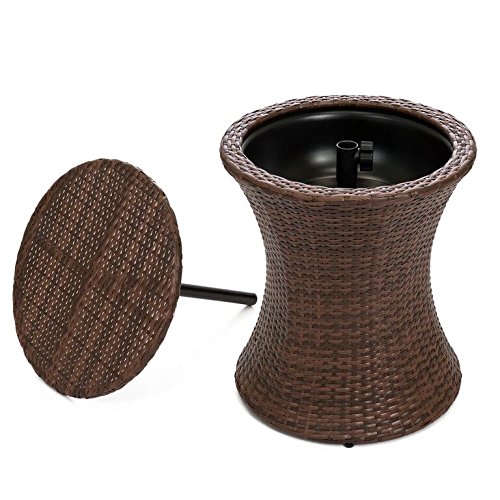 -. Feature : Classic cooler table combo is composed of an all-wicker and steel frame construction-perfect for any patio or backyard / An intuitive design allows you to raise the removeable lid to a max height of 41.5 inches and snap it into place for a fully functional bar table and ice bucket / Clean-up is easy as well, with a built-in drainage plug that lets you empty out melted ice and water without hassle / Dual-tone brown finish of this bucket will combine a modern, elegant, and convenient appeal that will blend perfectly with your outdoor décor / Overall Dimensions: 20"(L) x 20"(W) x 23.5-41.5"(H); Bucket Capacity: 7.5 Gallons; Table Capacity: 44 lbs.