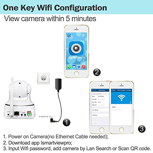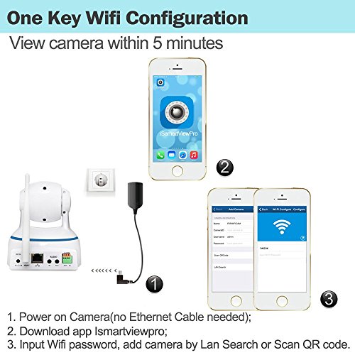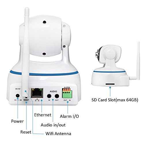 -. Feature : HD 1080P Resolution: Full HD 1080P at 30fps enables to view the target places very clearly. / Plug & Play: Quick Wifi setup with Iphone, Android, Ipad by using free iSmartViewPro app / Pan & Tilt: Wide angle of Pan 350 degree(Horizontal), Tilt 100 degree(Vertical), digital zoom. / 2-Way Audio: built-in speaker and microphone allow voice communicating between camera and app. / SD Card Recording: Support video recording and playback via SD card up to 64GB.