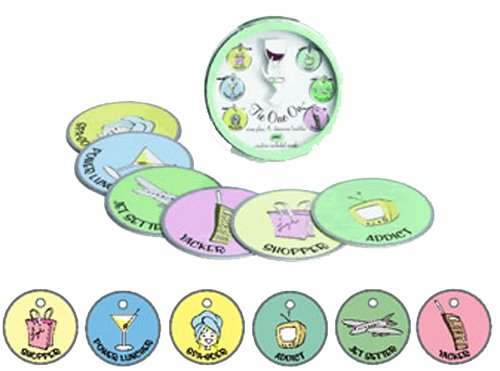 -. Brand : Tie One On -. EAN : 0815045001765 -. Feature : Humorous saying wine charms with matching coasters / Different color charms with titled "Jet Settert", "Shopper" "Power Luncherr" / "TV Addict" "Gym Goer" "Phone Jacked" / Wine charm measures 75" in diameter / Six charms and matching coasters -. Label : Tie One On -. Manufacturer : Tie One On -. Model : WC107 -. MPN : WC107 -. PackageQuantity : 6 -. PartNumber : WC107 -. ProductGroup : Kitchen -. ProductTypeName : KITCHEN -. Publisher : Tie One On -. Studio : Tie One On -. Title : Tie One On Mixed Bag Wine Glass Charms and Coasters -. UPC : 815045001765