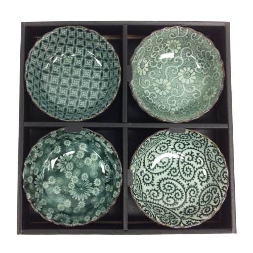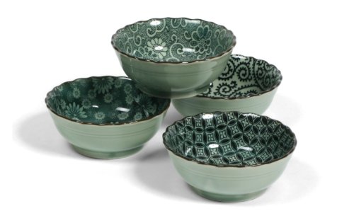 Set of 4 bowls, which highlight the patterns with a beautiful greenish-gray background. The versatility of the bowls make this set modern.