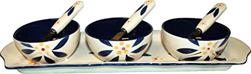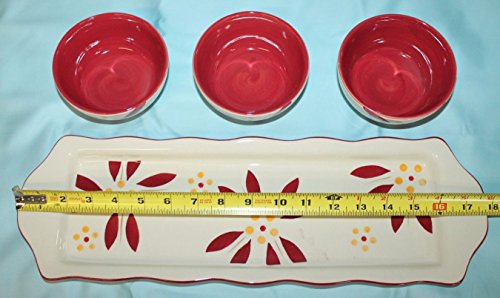 Studio : Temp-tations Publisher : Temp-tations Product Description Nuts, cheeses, jams, jellies, toppings, dips, sauces and other tasty nibbles will easily be elevated to elegant appetizers when served up in this beautiful ceramic trio. Resting on a coordinating tray, each 8-oz bowl comes with a matching spreader. Use the tray for crackers, fruit, veggies ! From Temp-tations(R) Ovenware. 0