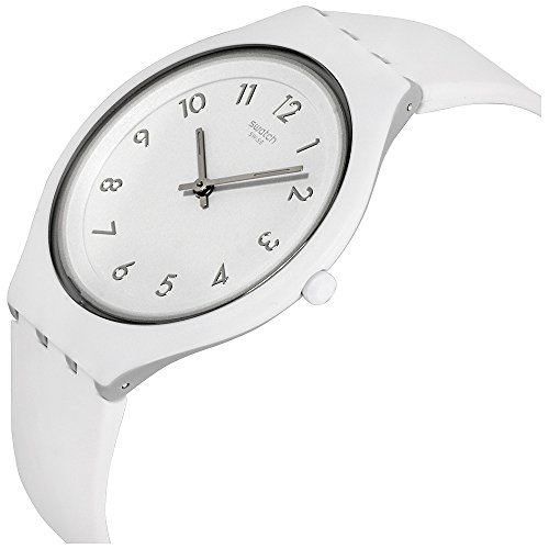 Swatch Skin Skinsnow White Dial Silicone Strap Ladies Watch SVUW101. 40 mm white plastic case with a white dial, a plastic crystal, silver tone luminescent hands, and silver tone Arabic numeral hour markers. Printed logo beneath the 12 o'clock position. Hands: hours and minutes. Case thickness of 6 mm. Push / pull crown. 17 mm white silicon strap with a plastic buckle clasp. Quartz movement and water resistant up to 30 meters. Skin series.Feature