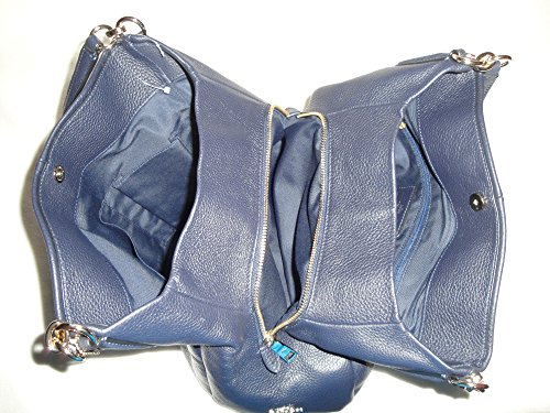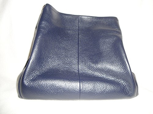 Navy Blue pebbled leather with polished brass tone hardware. 3 main lined compartments; center zips shut and outer have a magnetic closure. Interior zippered pocket, multifunction slip pockets, pen slip. Dual handles with a drop of about 8". Measures approximately 15" (L, bottom) x 13" (H) x 5" (W)