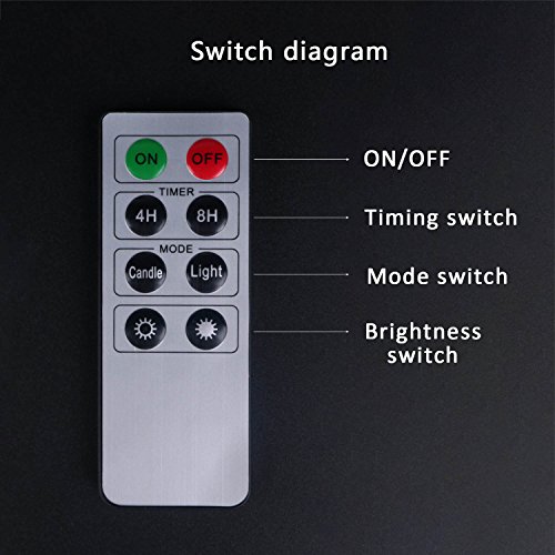 Easy to use, simply switch on / off on the bottom to control the candle light, use the remote to switch between on/off condition in a distant; Timing Function(4H or 8 H); You can adjust the brightness of light