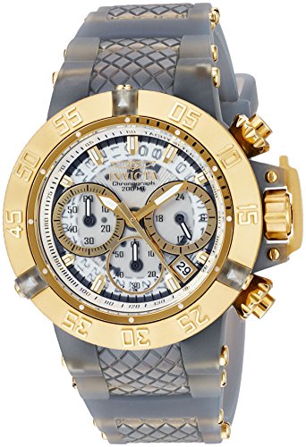 Invicta 24379 Subaqua Noma III Anatomic chronograph women's dive watch features a 42mm wide and 16mm thick grey transparent plastic case with a unidirectional rotating gold tone stainless steel bezel and textured screw down crown with function pushers. Invicta 24379 is powered by Japanese SII VD53 quartz chronograph movement. This beautiful watch also features a textured clear transparent dial with white accents gold tone luminous hands and index hour markers along with the chronograph, 12/24-hour time and date display functions, scratch resistant mineral crystal and water resistant to 200 meters. Invicta 24379 is equipped with a 25mm wide grey transparent silicone rubber and plastic strap with a buckle clasp. Invicta 24379 women's Subaqua Noma III transparent dial chrono plastic & silicone strap dive watch is brand new and comes in an original Invicta gift box and is backed by a 5 year limited warranty.Feature