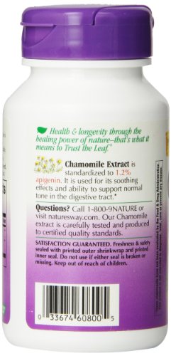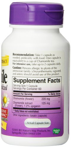 -. Binding : Health and Beauty -. Brand : Nature's Way -. Label : Nature's Way -. Manufacturer : Nature's Way -. NumberOfItems : 1 -. ProductGroup : Health and Beauty -. ProductTypeName : HEALTH_PERSONAL_CARE -. Publisher : Nature's Way -. Studio : Nature's Way -. Title : Nature's Way Chamomile