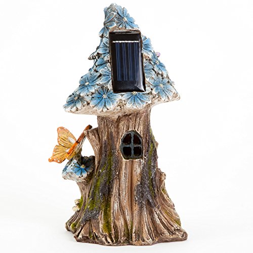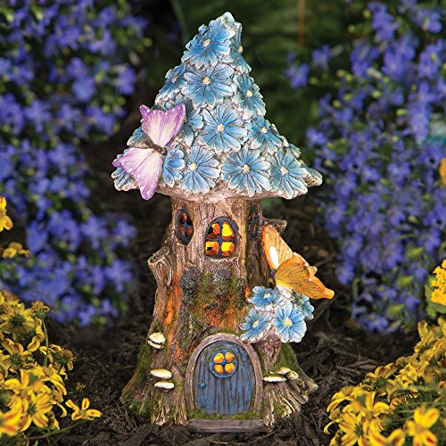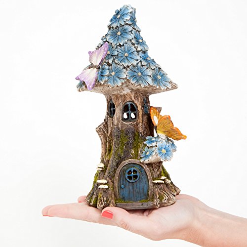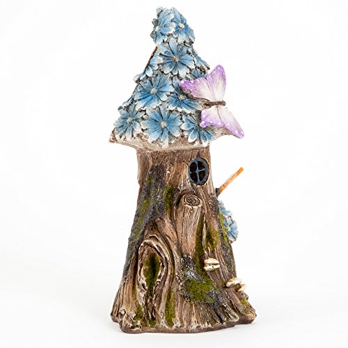 Bits and Pieces Solar Butterfly and Blue Daisies Fairy House - Unique Lawn and Garden Décor