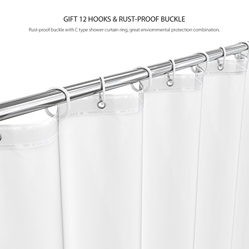 4.✔ CONVENIENCE: It is easy to prevent mildew and hard water stains by wipe clean.12 shower curtain hooks for easy installation and rustproof metal grommets easily accommodates all shower curtain rings and adds stability to the curtain.