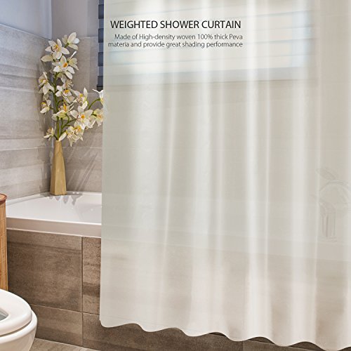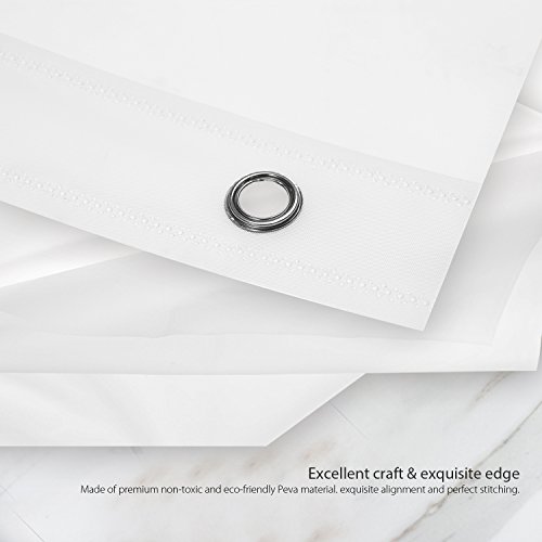 1.✔ SAFE FOR YOUR FAMILLY: Our shower curtain is made of non-toxic and eco-friendly Peva material. It does not let off a chemical smell and chlorine free. Many low quality PVC material shower curtain always sale as low price but with terrible smell, We are committed to creating a product that is safe for you and your family.