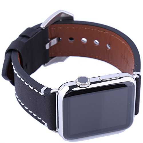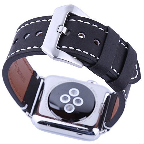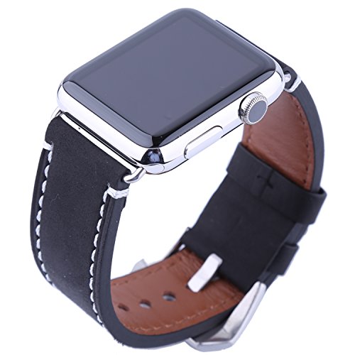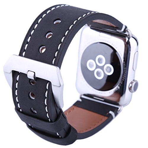 For Apple Watch Band 42MM, Sawz Premium Crazy Horse Genuine Leather Replacement Wrist Band Strap Bracelet with Stainless Metal Clasp Buckle for Apple iWatch Series 2 Series 1 Sport Edition (Black)