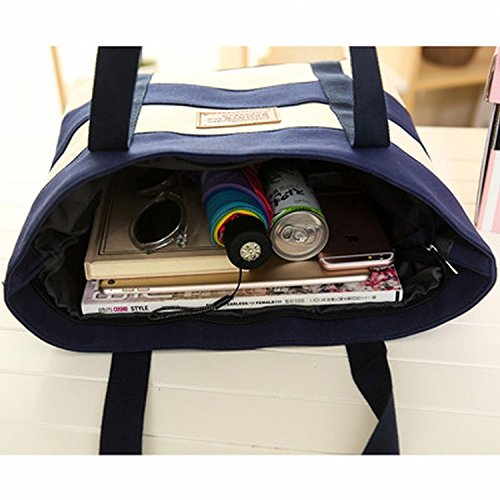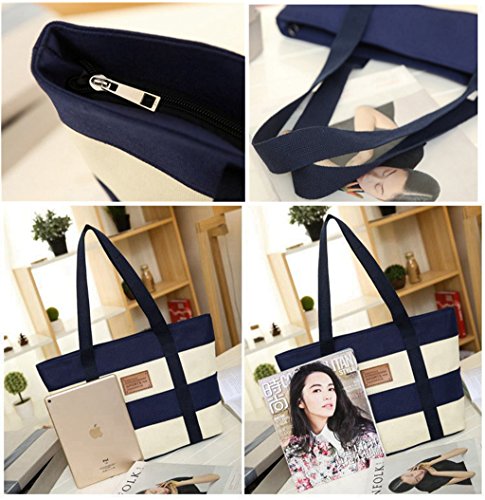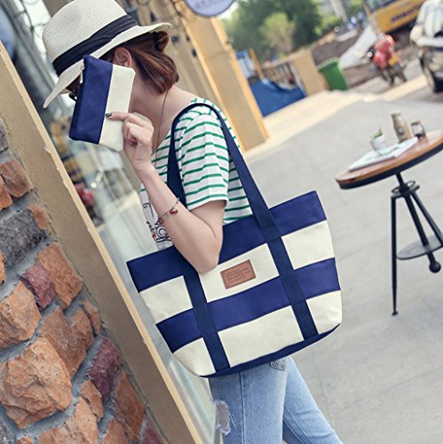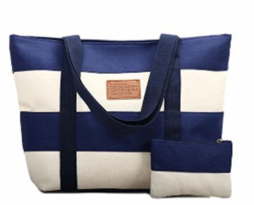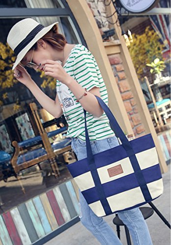 Women's Canvas Tote Bag Large Capacity Stripe Handbag Casual Shoulder Bag Shopping Bag with Small Purse