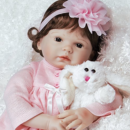 Bunny Love's hair is a lovely shade of auburn with reddish highlights and delicate flyaway curls that fall just under her ears. Her hand-painted eyebrows frame her ever expressive brown eyes, and rosy cheeks, lips, hands and feet make her appear to be a real living, breathing baby. Bunny Love is as cute as she is elegant; her slightly bent knees, outstretched fingers and toes, and flexible body make her even more realistic. She'll hop into your heart along with her cuddly companion, a white and furry floppy eared plush rabbit who is ready to be held by some bunny special.