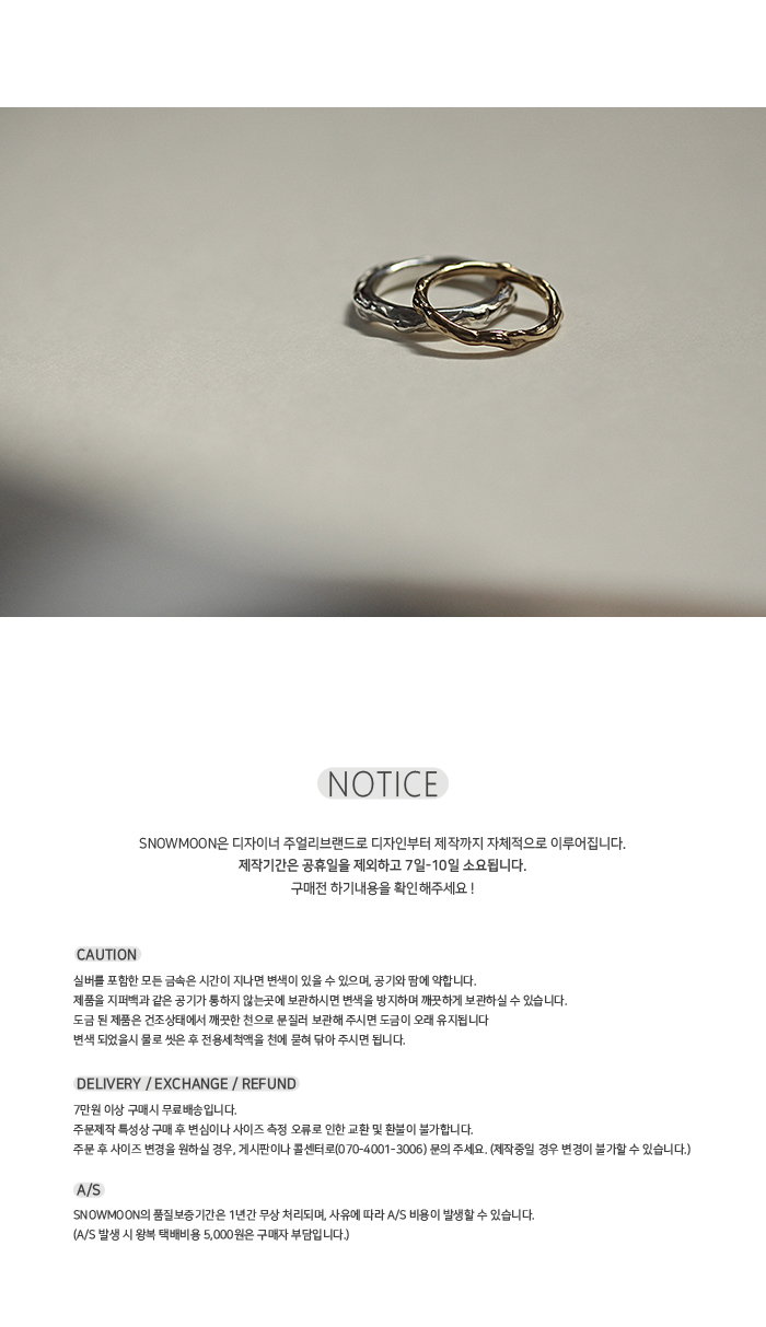 - 주문시 유의사항 : - SNOWMOON은 디자이너 주얼리브랜드로 디자인부터 제작까지 자체적으로 이루어집니다. - 제작기간은 공휴일을 제외하고 7일-10일 소요됩니다. - 주문제작 특성상 구매 후 변심이나 사이즈 측정 오류로 인한 교환 및 환불이 불가합니다. - 구매전 product info와 하단 NOTICE를 꼭 확인해주세요! #1 링을 감싸 흐르는 라인에 볼륨감이 느껴지는 디자인 입니다. 높이에 비해 두께감이 있어 묵직한 느낌 또한 매력적입니다.