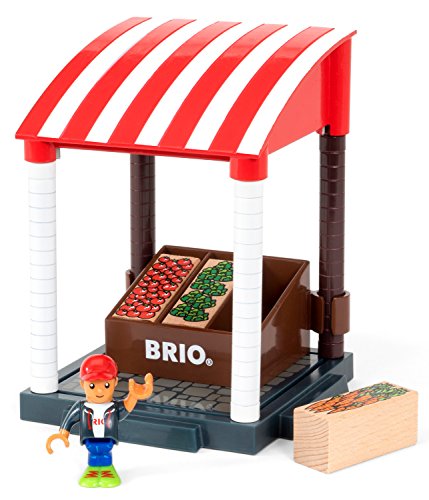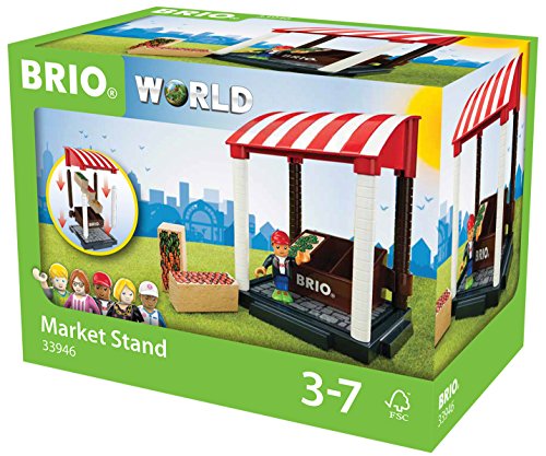 Market stand, compatible with the Village theme. Village is a NEW theme within the BRIO World concept – filled with play values and experience. The Village encourages social roleplay and invites children to play together by telling stories from their everyday life. The Village theme consists of several modular toys like a house, school, singing stage and ice cream stand. This theme offers suggestions but encourages children to create their own settings. A variety of different characters help to get the roleplaying started. All pieces of the Village theme are modular-scaled to fit the rest of the BRIO World and can easily be connected and expanded with the other themes in the BRIO World. BRIO creates innovative, high-quality and well-designed toys with clean, simple designs that spark children's creativity and imagination while encouraging and supporting each stage of their development. For over a century, our mission has been to create happy childhood memories. All wooden parts are made from 100% FSC-certified beech wood from sustainably managed forests and are built to last for generations.Feature