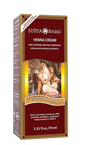 Studio : Surya Nature, Inc Publisher : Surya Nature, Inc Binding : Health and Beauty Product Description Henna Swedish Blonde Cream 2.31 oz CreamProduct Description Winner of the Best of Natural Beauty Awards, Surya Brasil's high performance Henna Cream Color is an anti-oxidant rich semi-permanent hair color that infuses hair with lush, vibrant color while nourishing with sustainably harvested botanicals. Every shade of Surya Brasil's sophisticated natural color contains vegetable extracts including herbs and fruits from Brazil and India, which offer simultaneous coloration and deep conditioning treatment for the hair as well as intense treatment for the scalp. While coloring gray on first application, Surya Brasil Henna Cream Color does NOT contain ammonia, PPD, parabens, peroxide, resorcinol, heavy metals, artificial fragrance, mineral oils, GMO's or gluten. Like all of Surya Brasil's products the Henna Cream is 100% vegan and cruelty free. Hair color shade results will vary as will the natural ingredients used in our henna creams and powders. These digitally-rendered photos are for demonstration only. They do not guarantee exact shade matches. - Use with the Color Fixation collection.