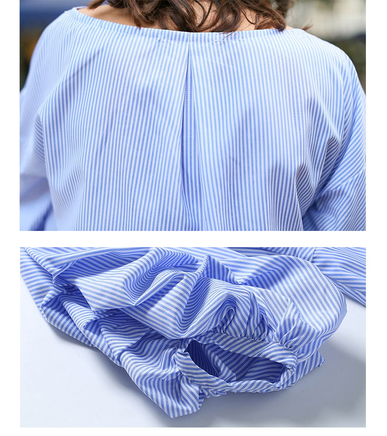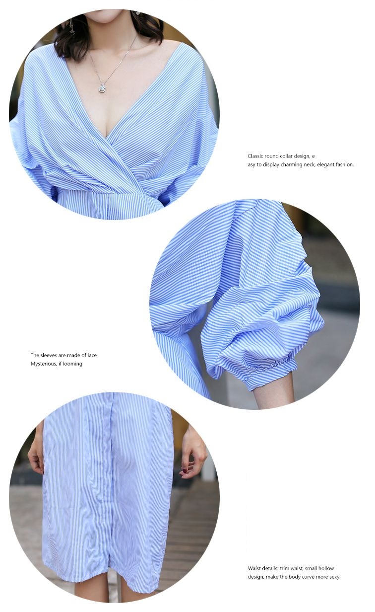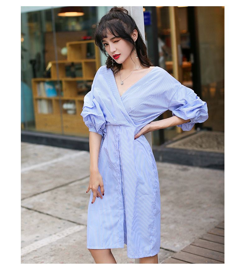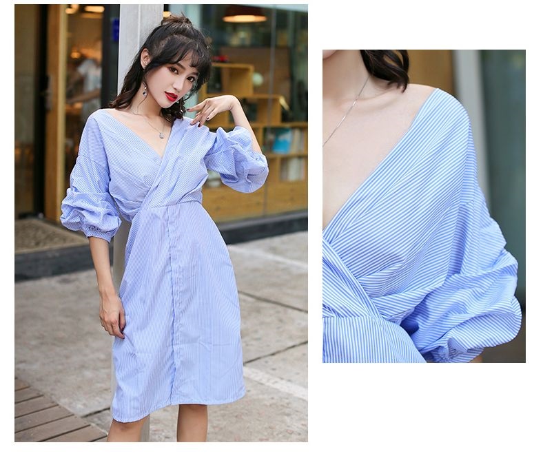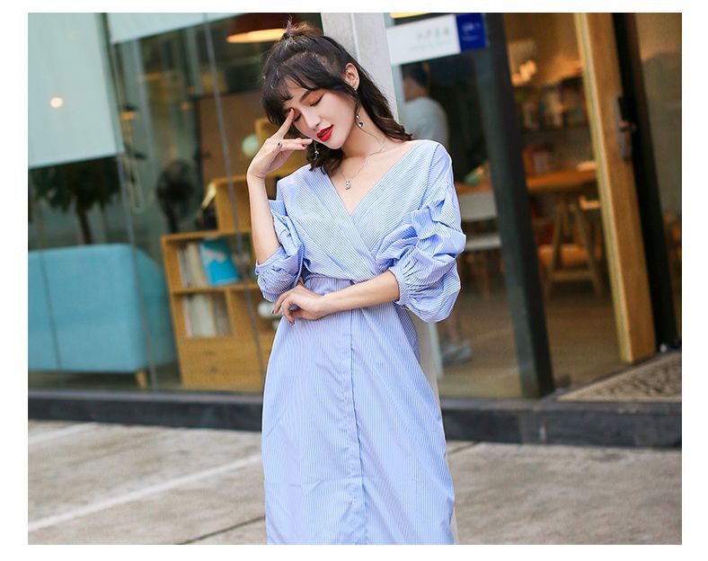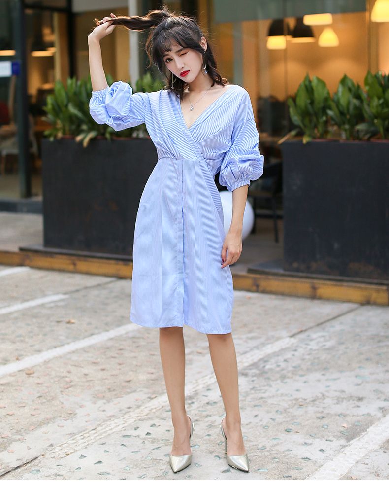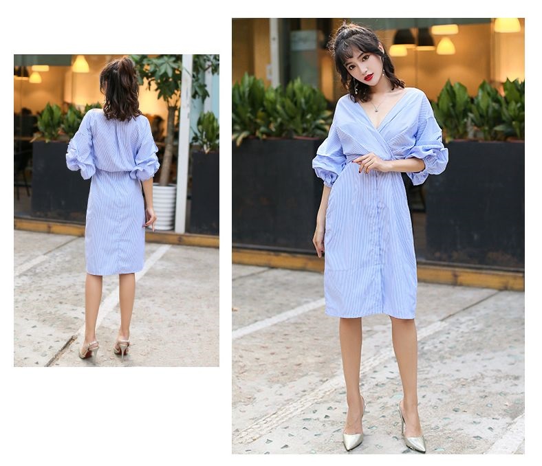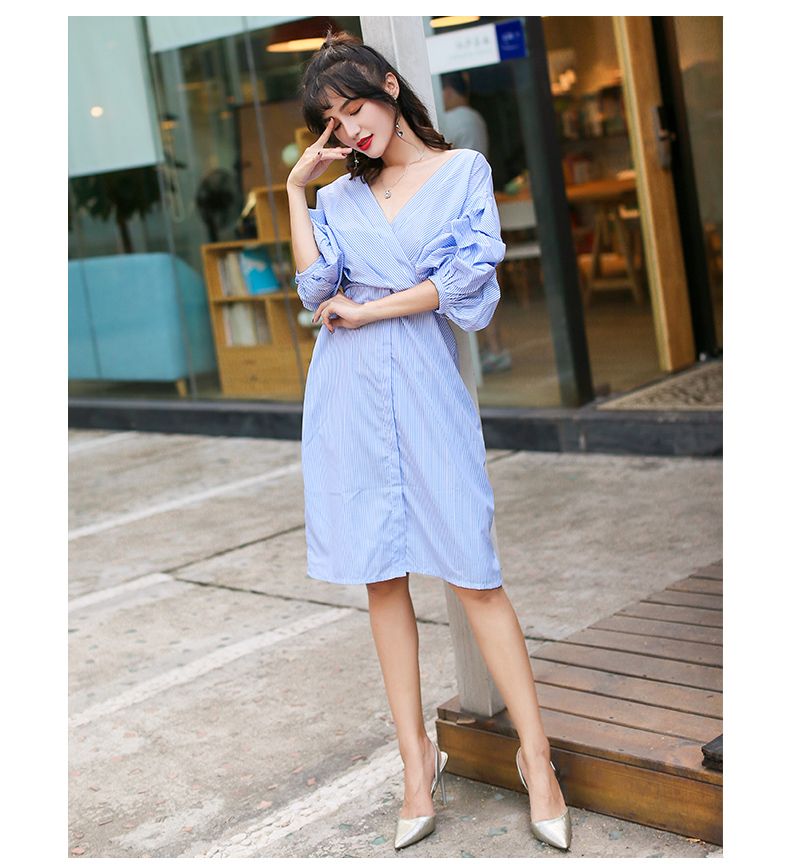 スカイブルーのストライプが爽やかなカクシュールシャツワンピースです。