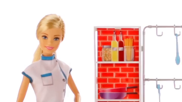 - Barbie doll will heat up the kitchen in a chef-inspired top with blue apron detail, black pants, blue shoes and an oven mitt