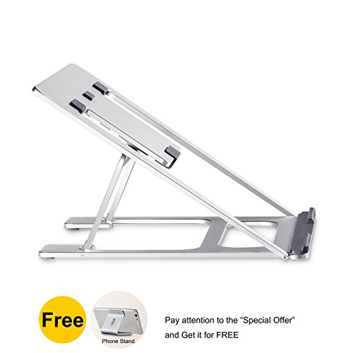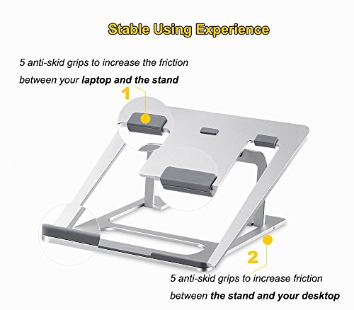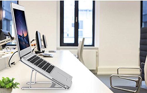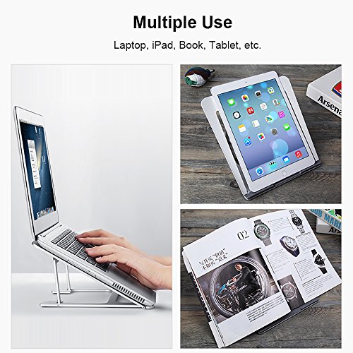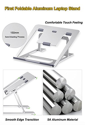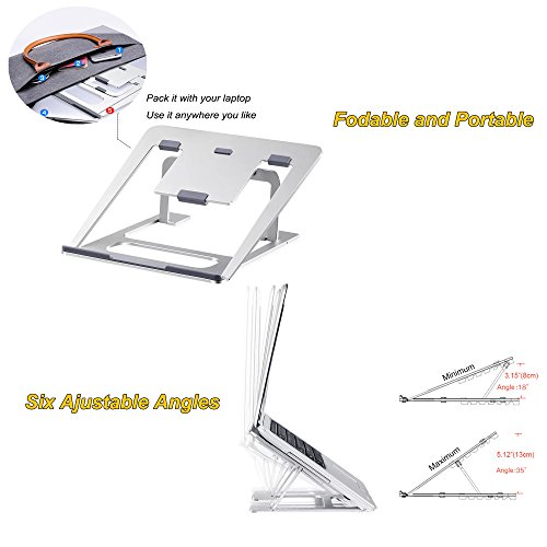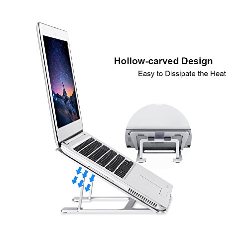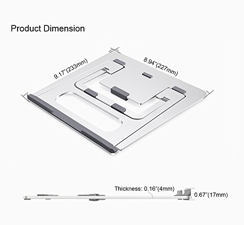 -. Feature : First Foldable Aluminum Stand with 6 Adjustable Height in the Market: Unlike other foldable stands in the market using the plastic material or Aluminium stand only have 1 height, this stand is specially made of 5A Aluminum material with 6 adjustable height, high quality and durable. The whole Aluminum body perfectly fits the temperament of MacBook, a must for MacBook users. Not suitable if the keyboard thickness of the laptop is more than 0.48inch(12mm) / Portable, Six Height adjustable: The foldable design makes it easy to carry and restore, its thickness is only 4mm, you can pack it with your laptop and use it anywhere you like. It has six slots for you to adjust the height of your laptop screen, optimizing viewing angle according to your need, relieving neck and back fatigue / Slide resistance: We have 5 anti-skid grips on the bottom of stand to increase fraction between the stand and your desktop, 5 anti-skid grips to increase the friction between your laptop and the stand and 3 anti-skid grips between slot and stand, giving you a very stable using experience / Hollow-carved design: The laptop stand has a whole Aluminum body with an elegant and compact looking. The hollow-carved design helps dissipate the heat and cool your laptop, you can put away heat sink and enjoy a quiet working environment / Dimension: 9.17*8.94*0.67 inches (233*227*17mm); Weight: 0.88lb (0.45kg); Support angle: 18°~35°; Support height: 3.15" ~5.12"(8cm~13cm); Max support weight: 22lb (10kg); Compatible with 7"~15" notebook laptop iPad tablet