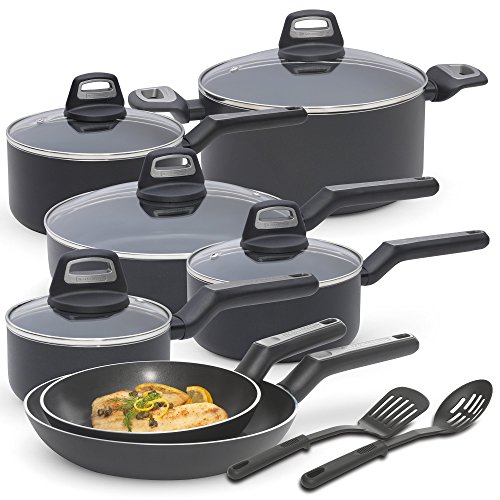 Studio : Black Decker Cookware Publisher : Black Decker Cookware Binding : Kitchen Product Description BLACK DECKER cookware is durable and brings reliable performance to your kitchen. The trusted tool for any kitchen, BLACK DECKER black nonstick is traditional and functional for home cooks and chefs alike. Whether you are cooking a meal for your family or friends, this cookware is easy to clean and withstands the demands for cooking on stovetops including glass, ceramic, gas and electric. It distributes heat evenly reducing hot spots allowing precise control and expected cooking results. BLACK DECKER brings innovative function and feel with its ergonomic, raised handle design that positions the hand away from the hot vessel for added safety, while the thumb indent located on top of each handle provides better control while maneuvering around the kitchen. This set comes with all the pots and pans you will need for frying, Sauteing, boiling and simmering foods to perfection. The tempered glass lids make it easy to monitor soups and sauces while locking in moisture. Includes: 8-inch fry pan, 10-inch fry pan, 1-Quart Covered Sauce Pan, 2-Quart Covered Sauce Pan, 3-Quart Covered Sauce Pan, 5-Quart Covered Dutch Oven, 10-inch Covered Deep Saute, 2 nylon tools. Instructions: Stovetop Use Only, Not for use in Oven. The bases of these pans are designed to conduct heat quickly and evenly. Follow recipes carefully during food preparation to ensure best cooking results. High heat is recommended for boiling only. Use Medium-High for frying, sauteing and searing. Low temperature setting is recommended for simmering and warming foods. Using high temperature nylon, silicone or wood tools is recommended for longer lasting beauty. 0