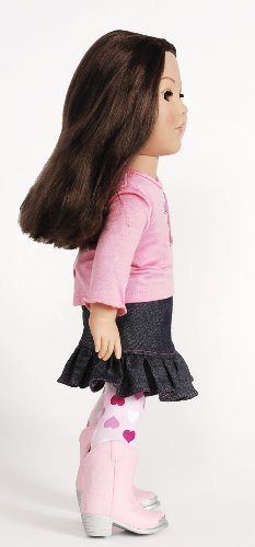 - Feature : New 18 inch play doll with Madame Alexander quality / Has long dark brown hair, brown eyes and a medium skin tone / She is wearing a denim skirt with darling pink cowgirl boots, a pink t-shirt and pink heart tights / Her rooted hair can by styled, and she has eyes with long lashes that open and close / Compatible with American Girl dolls