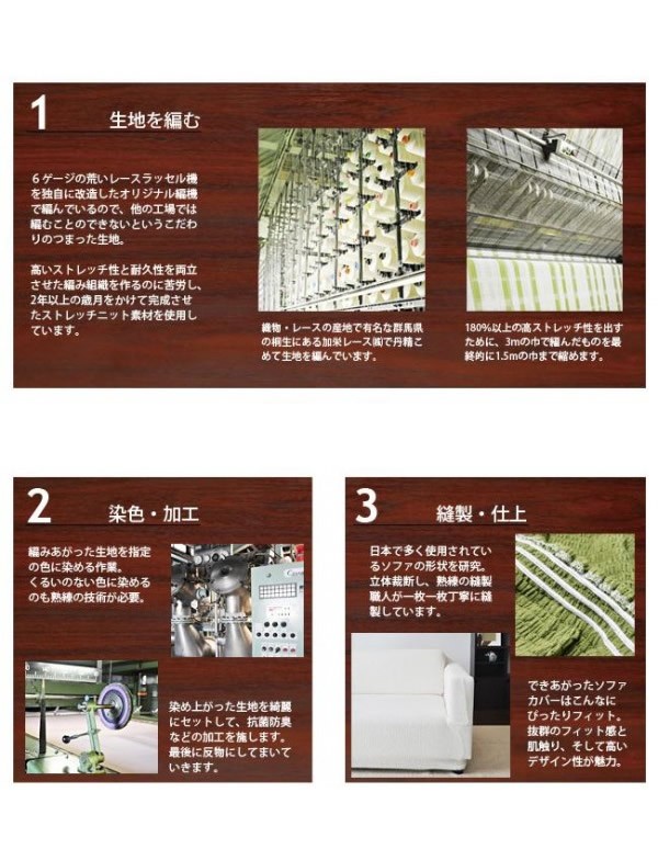 | 縦横自在に伸びて、ソファにぴったりフィットするソファカバー。ストレッチ性を極限まで高めたスーパーストレッチニット生地を使用。女性一人でも簡単に着脱ができる手軽さも魅力です。SEKマーク取得の抗菌防臭加工も施し、いつでも快適に愛用できます。ベーシックなカラーリングと挿し色を含めた6色展開。お部屋のイメージに合ったカラーをお選びください。日本製。 |