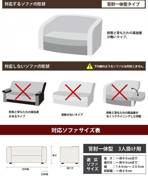 | 仕様 | 抗菌防臭加工(SEKマーク取得) ウォッシャブル(洗濯機洗い可能・ネット使用) 【適応ソファーサイズ】 高さ:~約90cmまで 奥行き:~約90cmまで 幅:140~200cm 肘掛幅:~約20cm |